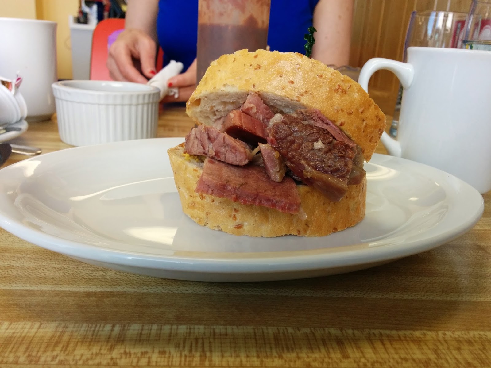 A classic looking joint attached to a strip mall, Bernstein's was a hopping place on a Saturday morning and everyone looked really happy to be there. Going for half a corned beef sandwich on Winnipeg rye so that I could save room for the Reuben burger, I am aware that I could have just ordered the Reuben sandwich. However, I needed to taste the pure corned beef before it got mixed in with bison ground meat to make the said Reuben burger.